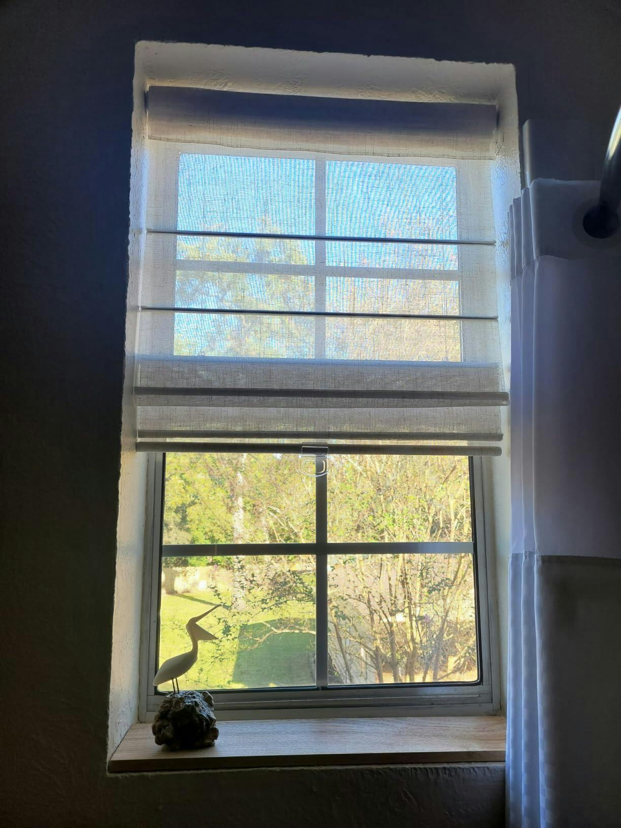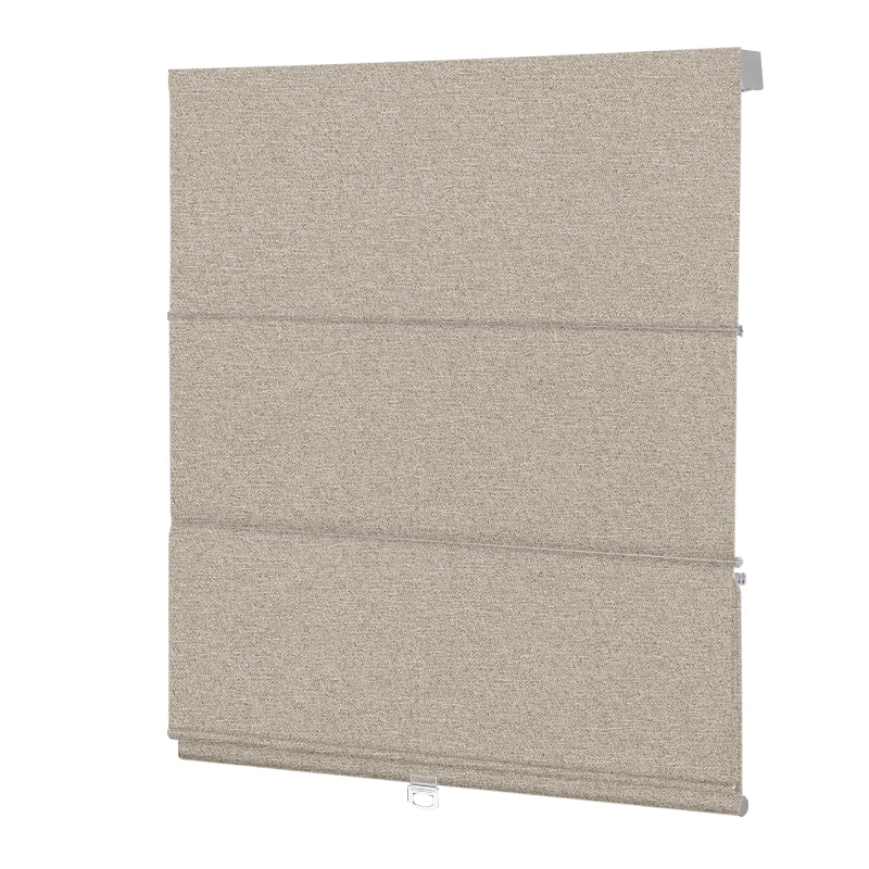 Our roman shades fold up into a tidy, flat stack — no bulging, no fuss.