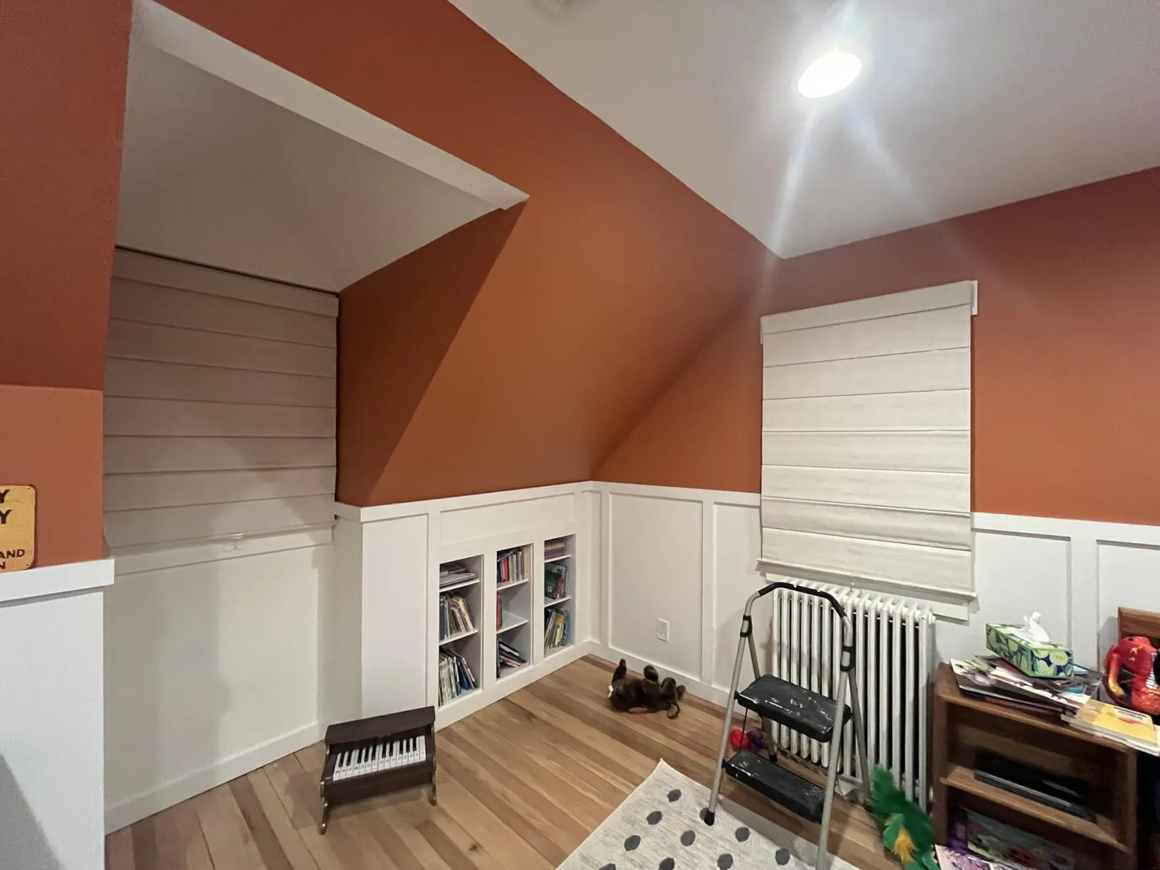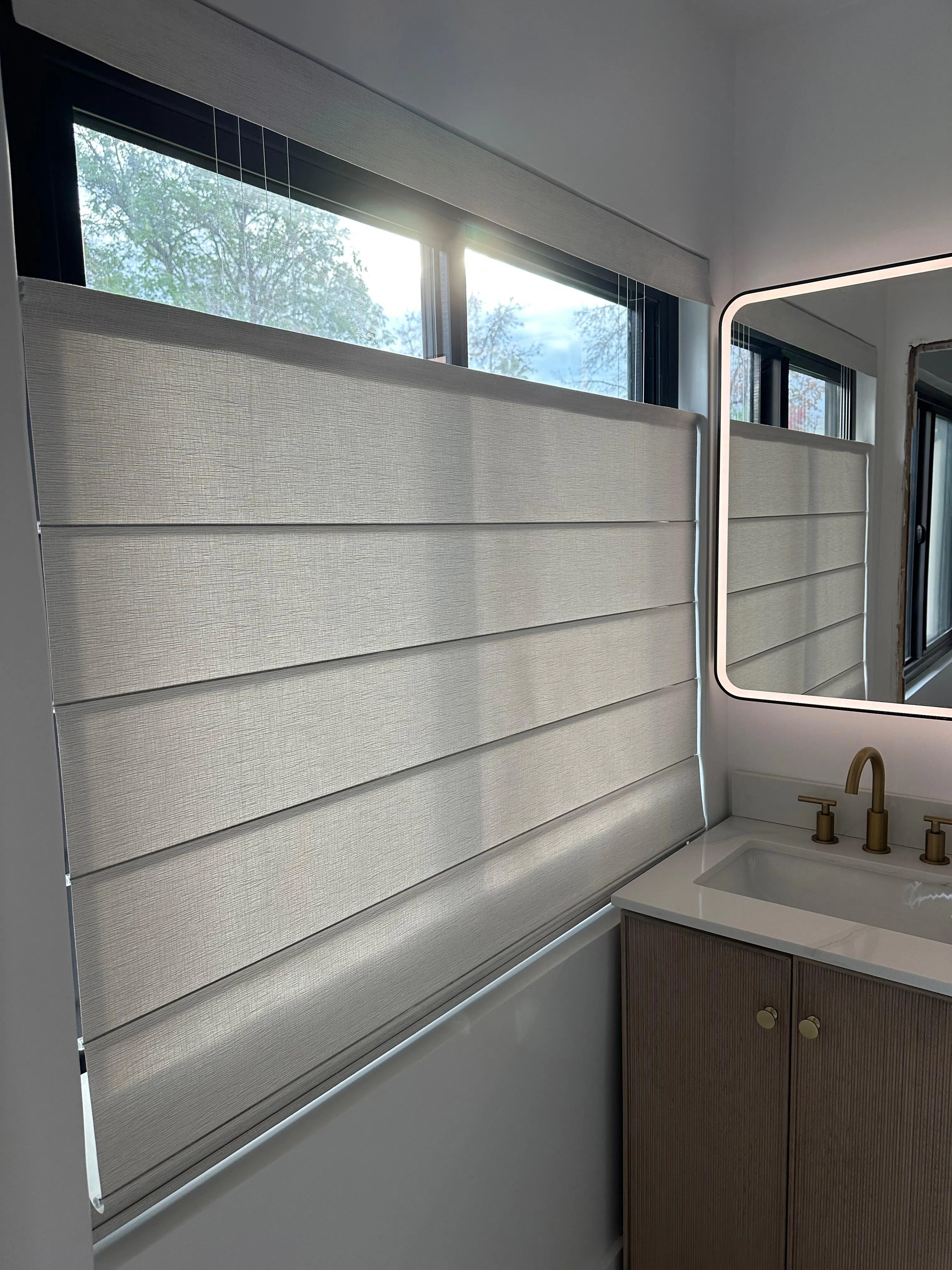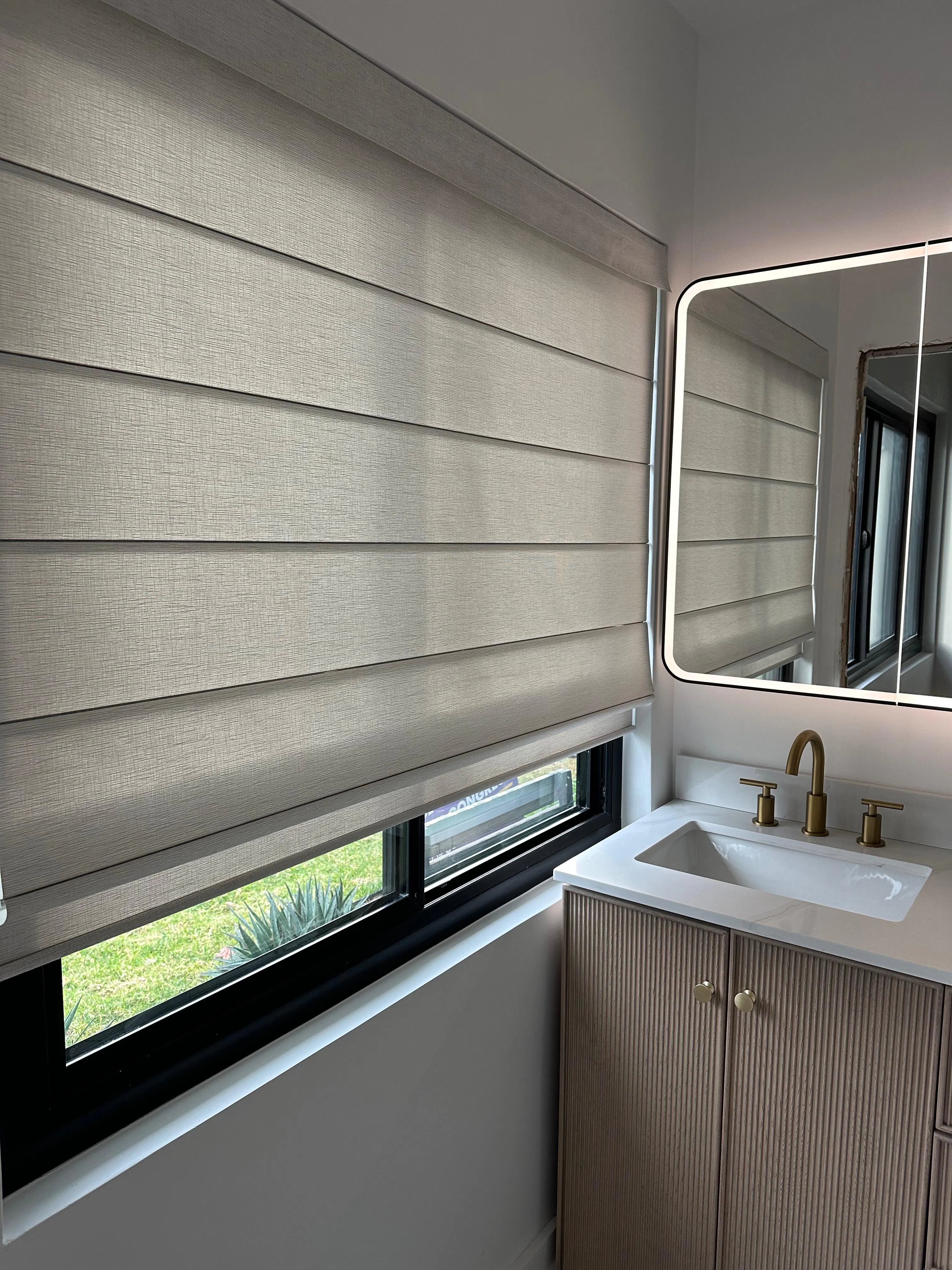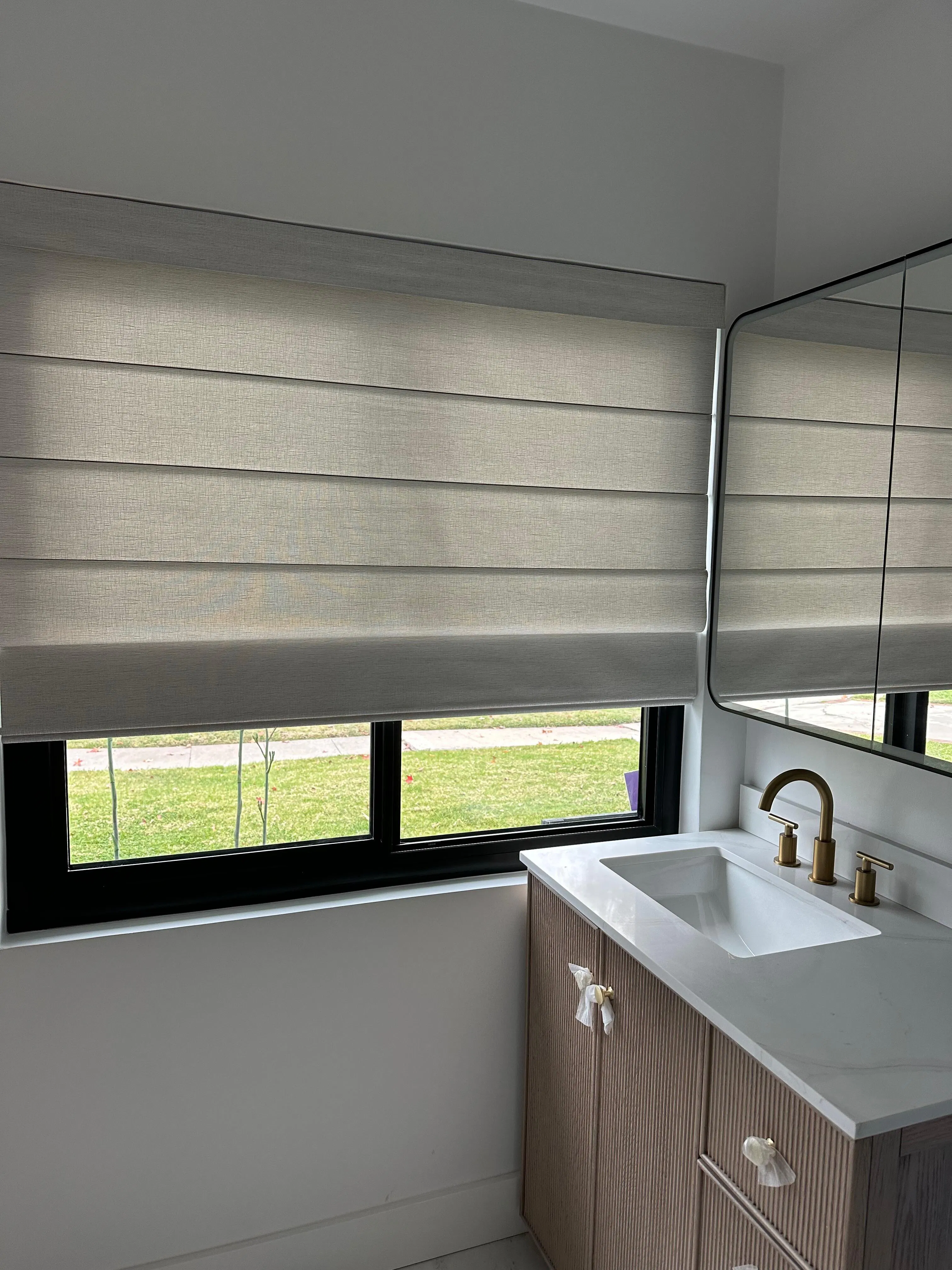 Our roman shades fold up into a tidy, flat stack — no bulging, no fuss.